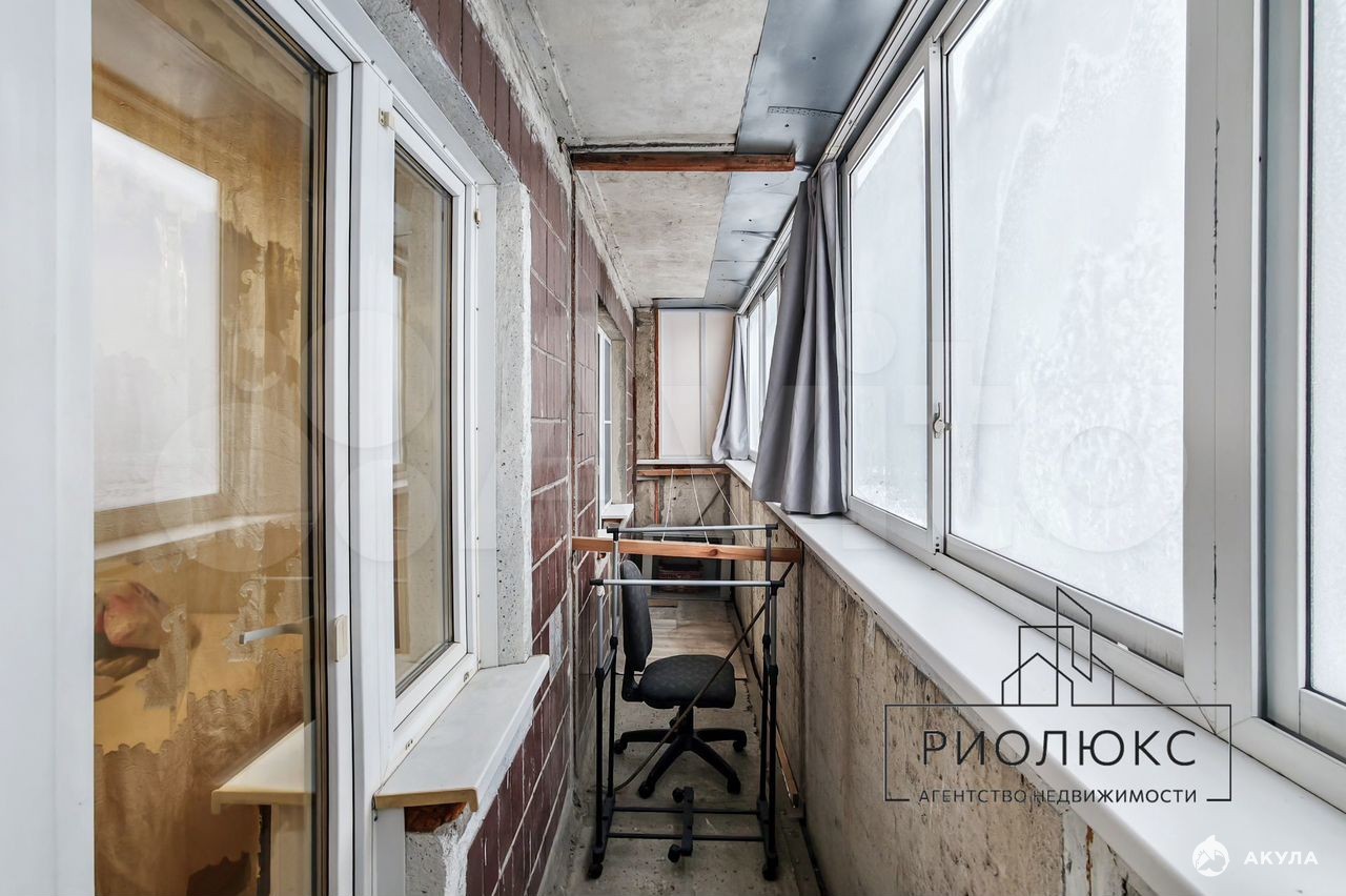 Балкон во всю квартиру с выходом из кухни и спальной. Установлены стеклопакеты.