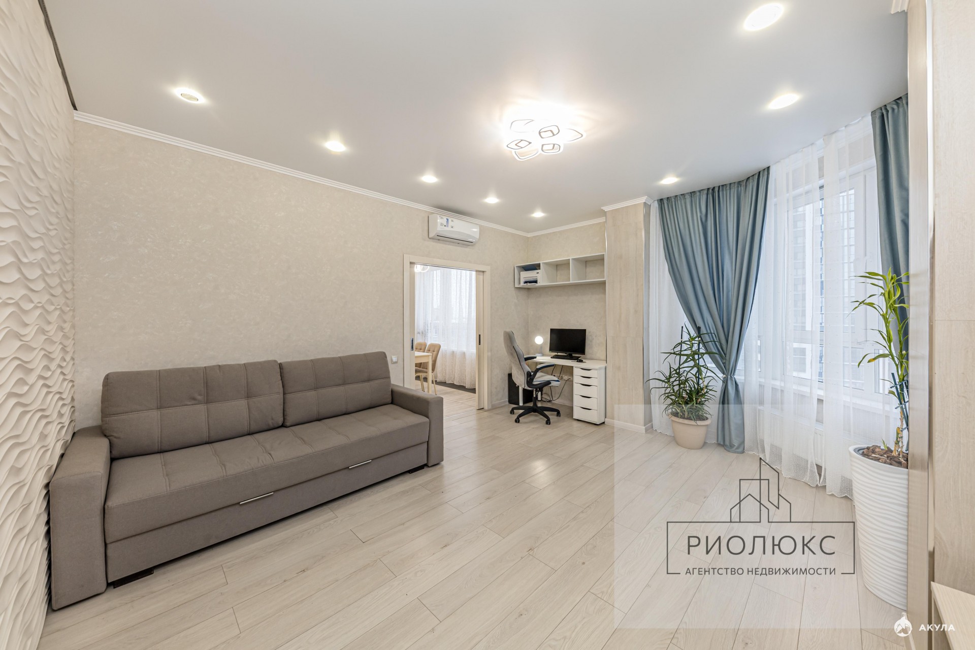 • Освещение — люстра и точечные светильники, светодиодная подсветка в карнизе. Одна стена оклеена гипсовой плиткой (волны), колонны обшиты ламинатом.