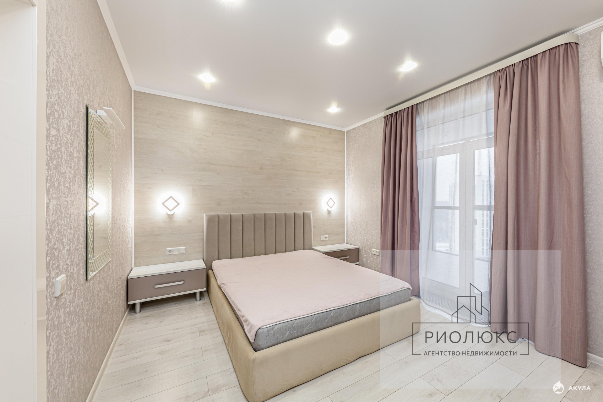 • Освещение многоуровневое: точечные светильники, люстра, подвесы, подсветка на встроенных шкафах.