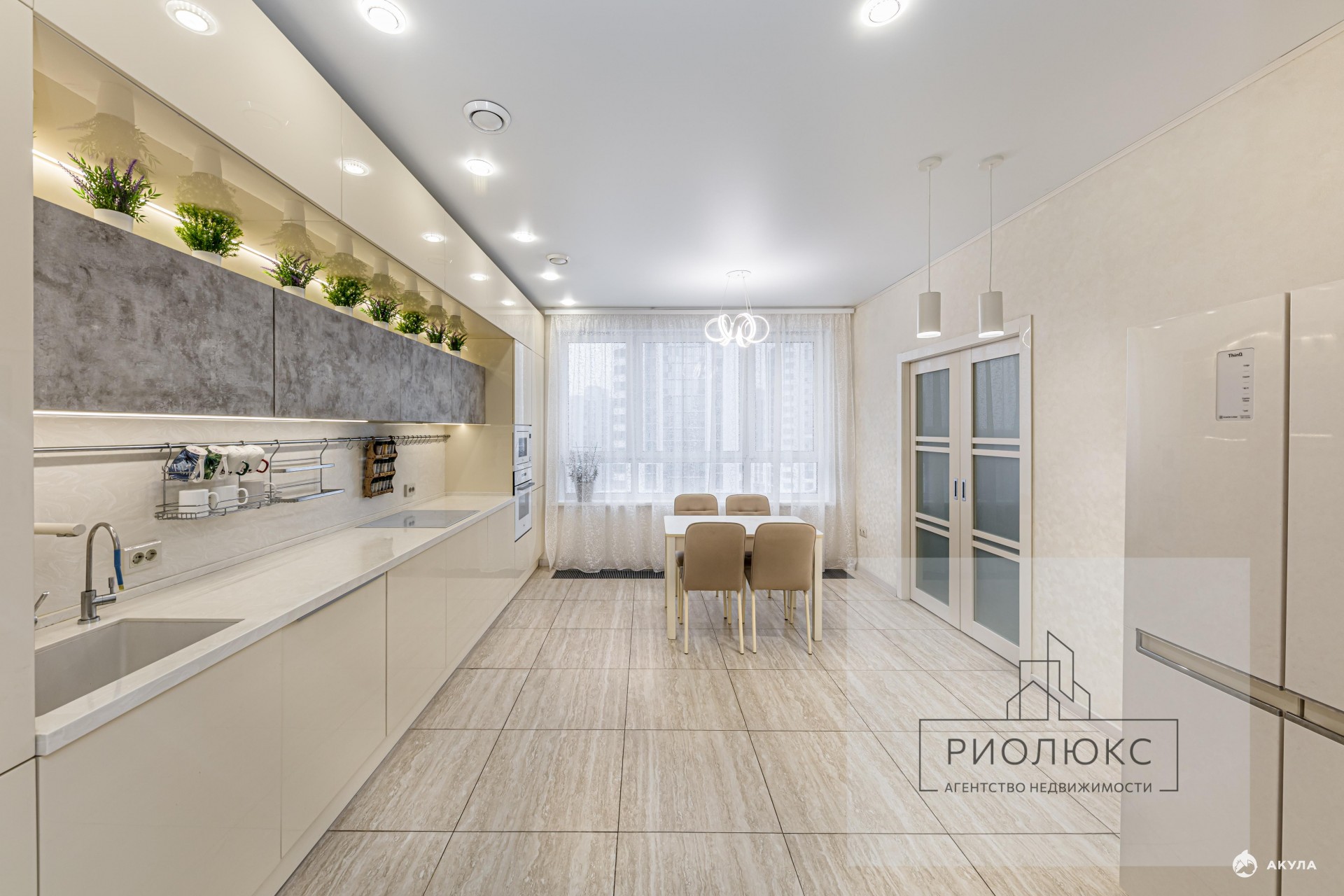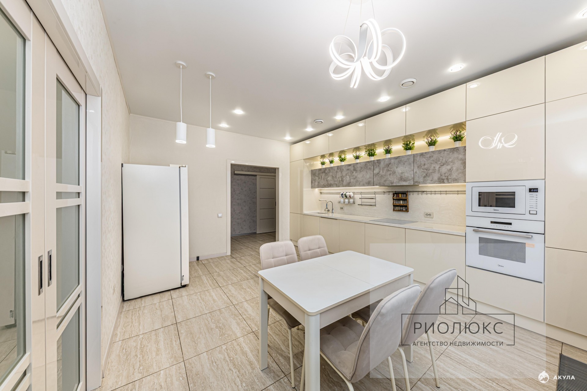 • Просторная кухня-столовая со встроенной кухонной мебелью по индивидуальному дизайну (глянцевые кремовые и под бетон фасады, столешница и фартук из искусственного камня).