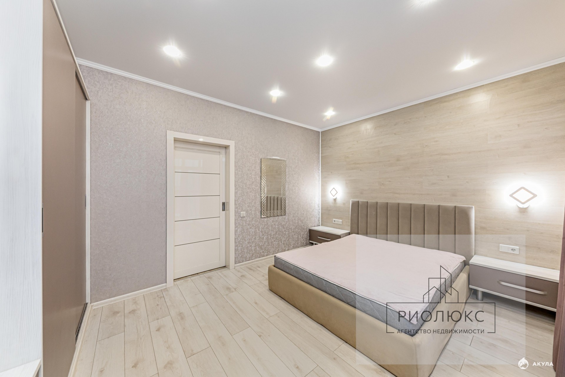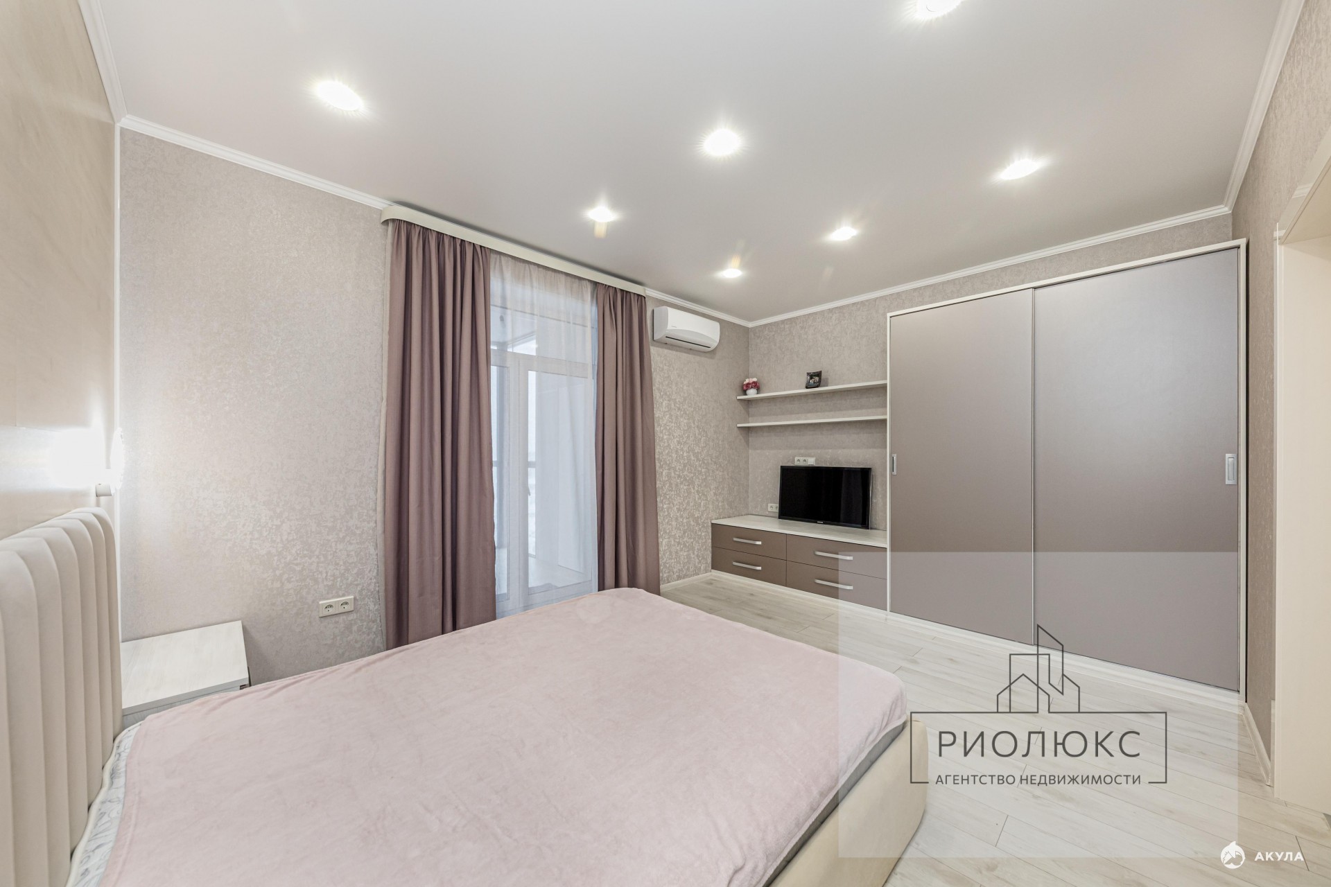 • Освещение многоуровневое: точечные светильники, люстра, подвесы, подсветка на встроенных шкафах.