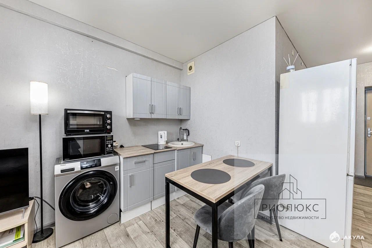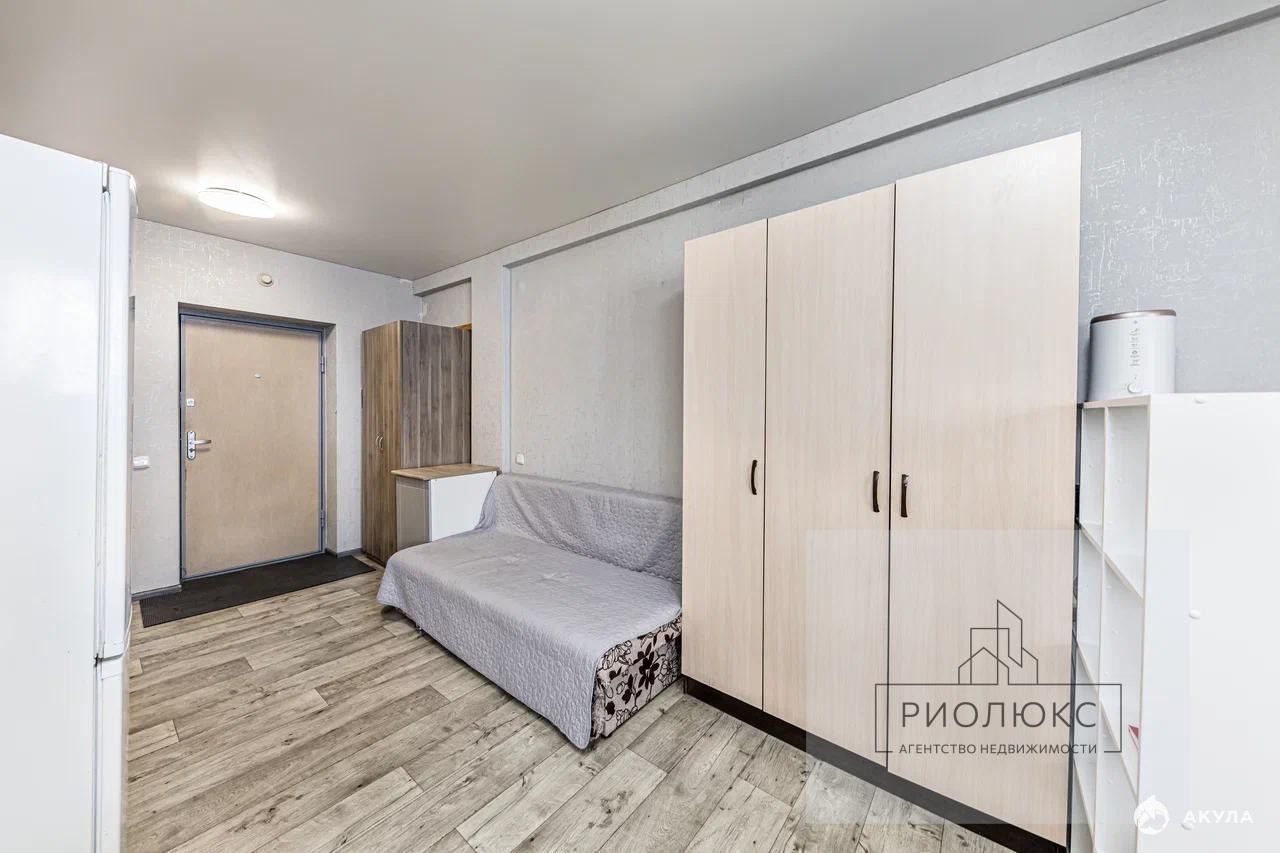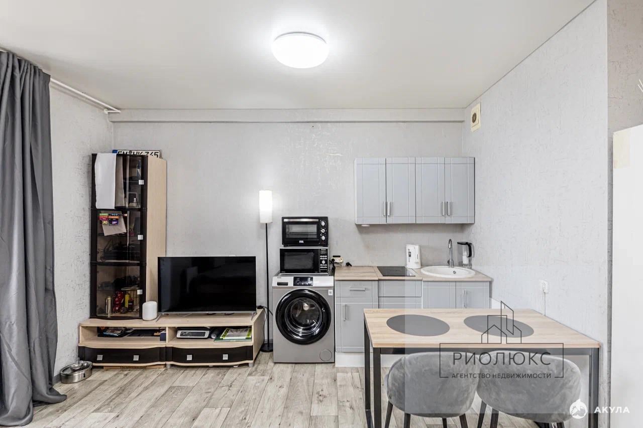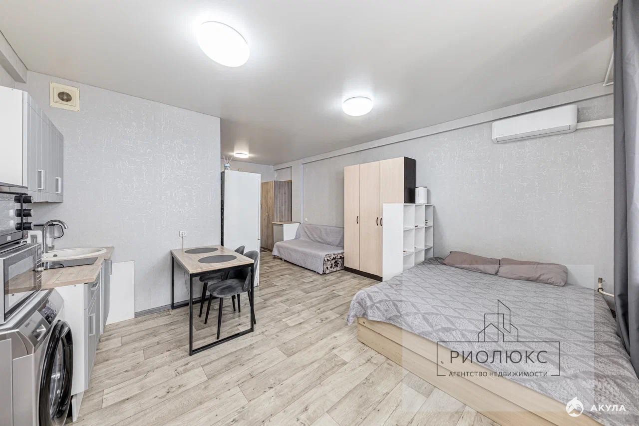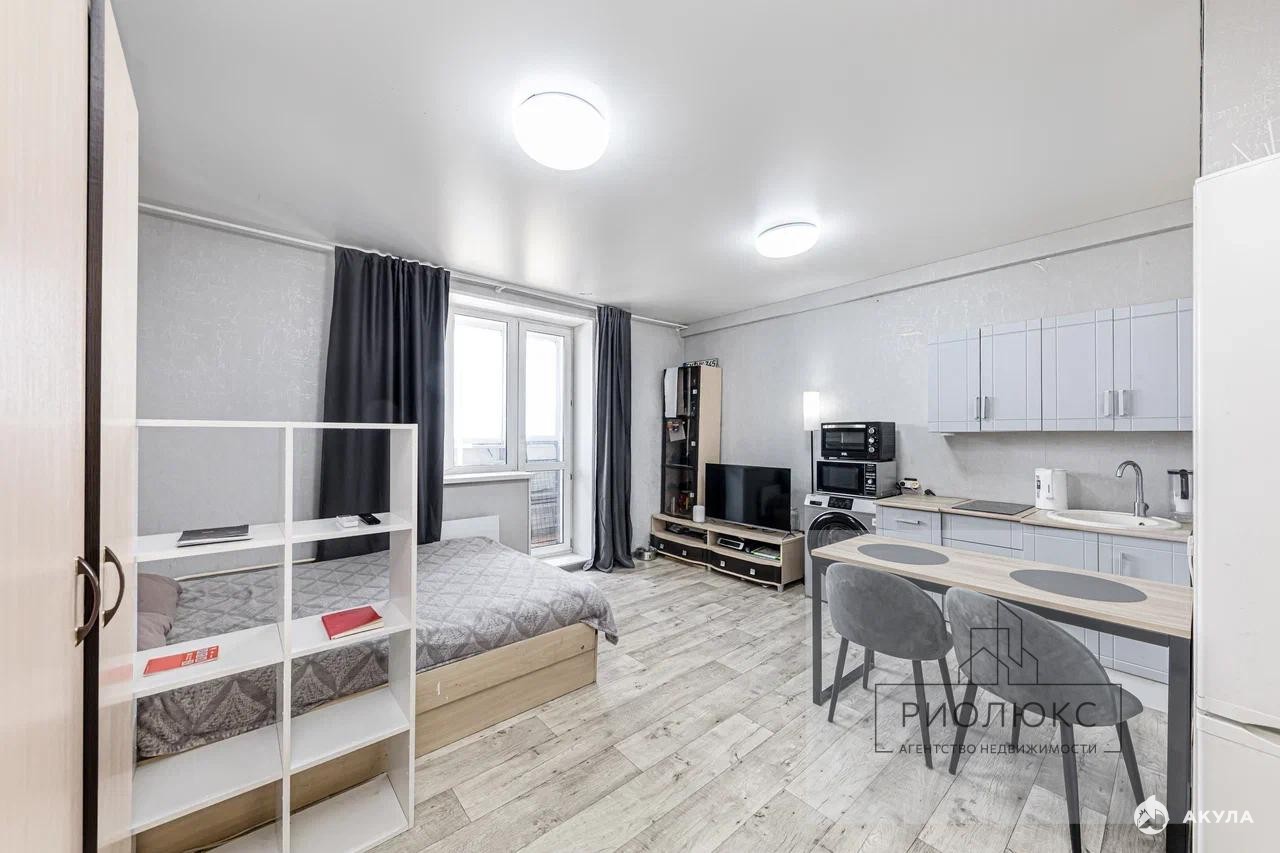 Представьте себе уютное гнездышко в небесах — это светлая студия на последнем, восемнадцатом этаже современного жилого комплекса. Из нее открывается захватывающий вид на город, будто вы парите над его ритмом и суетой.